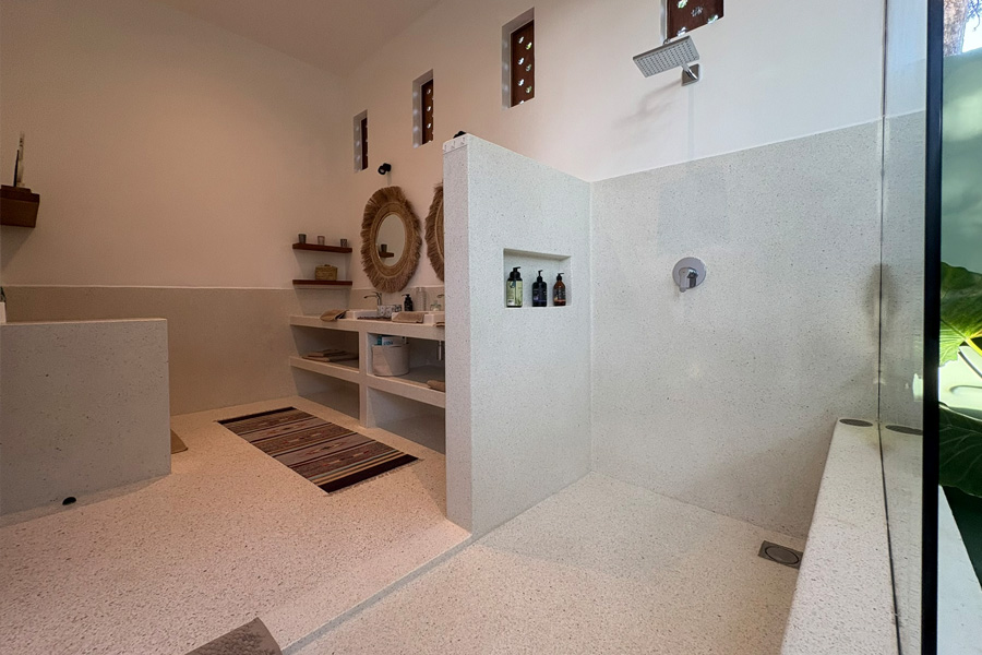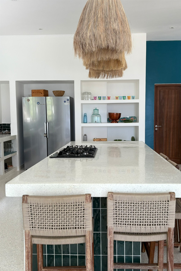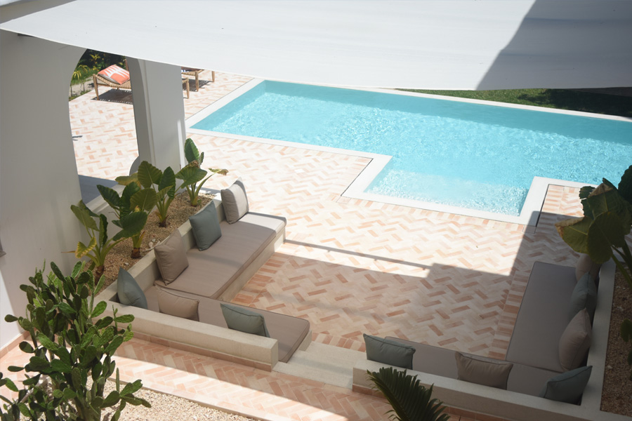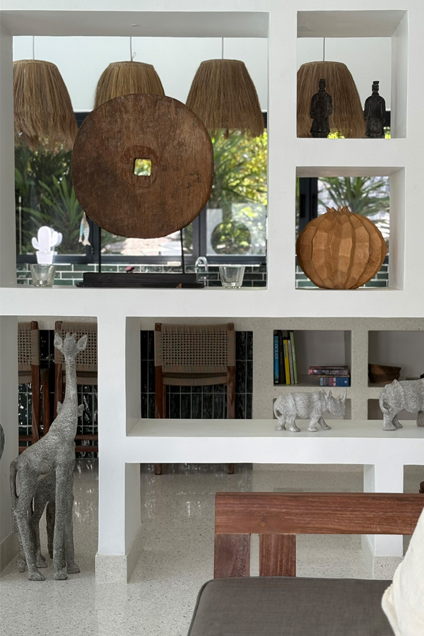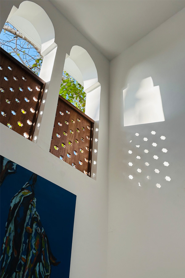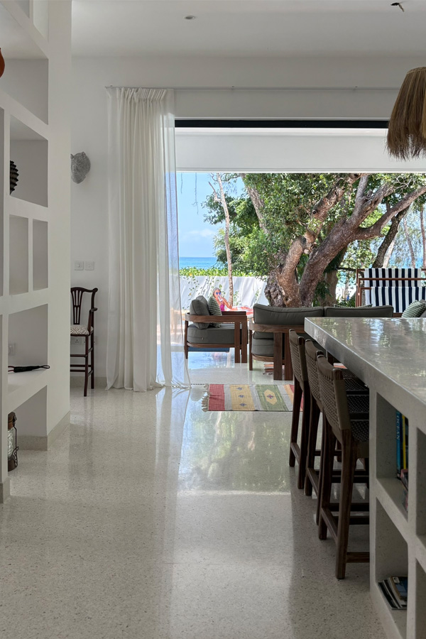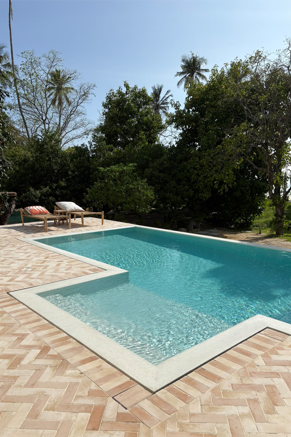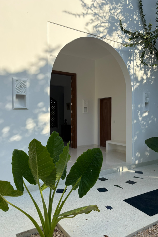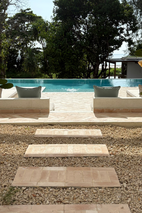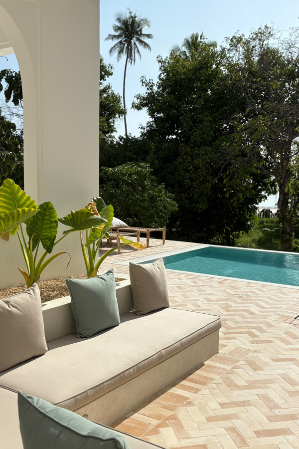 Located off the beaten track, along Galu Beach underneath the shade of African Fig and Indian Almond trees lies a gem of a plot. The project brief was to develop a 4-bedroom family holiday home with a swimming pool and 2-bedroom guest cottage. The plot itself is dotted with beautiful mature trees and spills out onto the beach. Careful not to interfere with the trees, the cottage is nestled on the lower half of the plot closest to the beach. The main house is elevated on a natural coral ridge looking over the cottage with views towards the ocean. The house was designed with a courtyard as its centre point off which all rooms gravitate. High floor to ceiling heights make for an impressive experience entering the house, with arch-framed views of the infinity pool, garden and ocean beyond.
