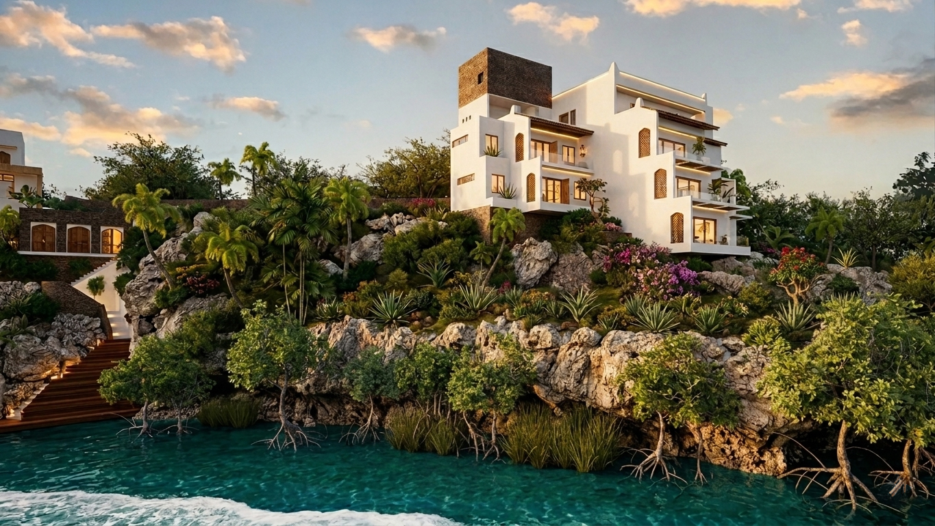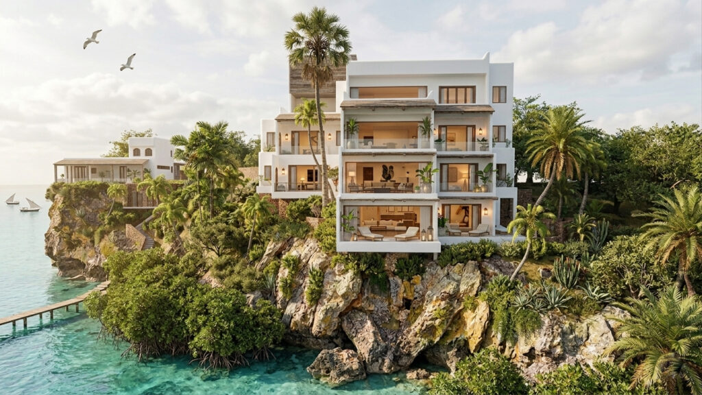 Proposal for a commercial development on Kilifi Creek, Kenya. The design includes luxury apartments, boutique restaurant and bakery. The small triangular shaped plot with an existing boundary on the north and cliff edge on the south posed both interesting and challenging constraints to work with. The singular 4-storey block of apartments has one apartment per floor. Each are 2-bedroom ensuite flats with breathtaking sea views.